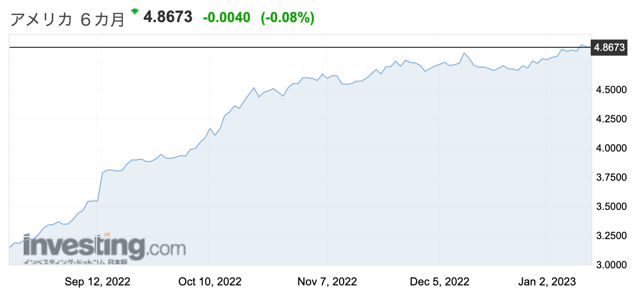 米国債6ヶ月金利はジリジリと上昇を続けていますが、1月12日時点でも4.86%であり、5%にはまだ距離があります。