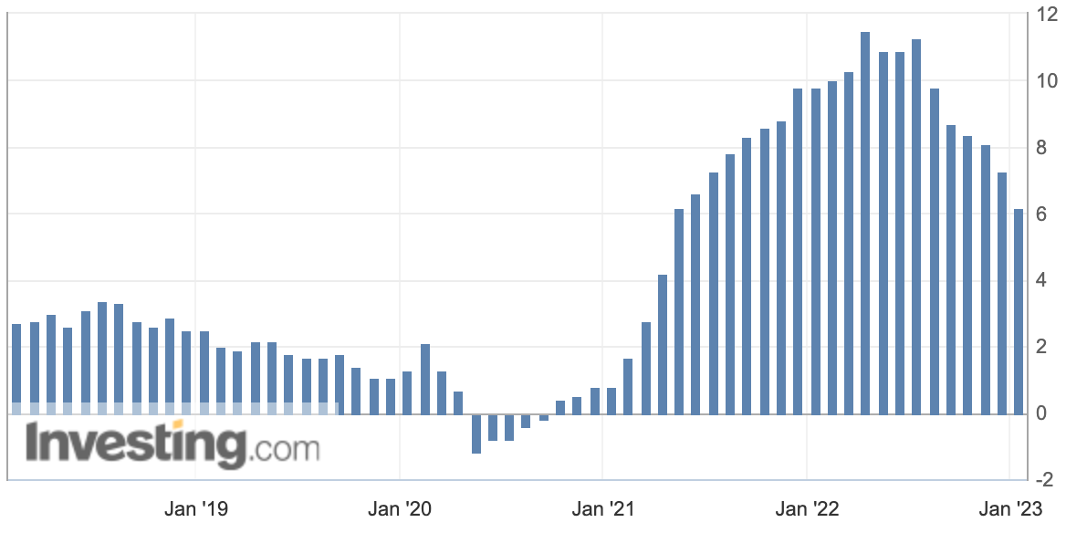 1月18日夜に発表された米国生産者物価指数(PPI)は、前年比+6.2%でした。これは市場予想の前年比+6.8%を0.6ポイント下回る数値で、アメリカのインフレが市場予想よりも急速に減速していることを示唆しています。