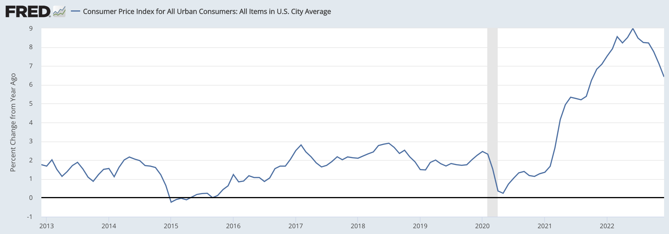 実際に米国消費者物価指数(CPI)を確認してみると、2022年5月以降は前年比+5%〜10%という高いインフレ率で物価が上昇していたことが分かります。