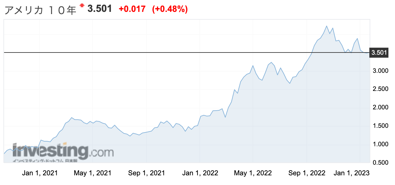 事実、FEDはFF金利を5%以上まで上げる予定だと何度も公言しているのに、米国長期金利は、昨年10月に一瞬だけ4%を超えたあと、頑なに3%台に居座っています。