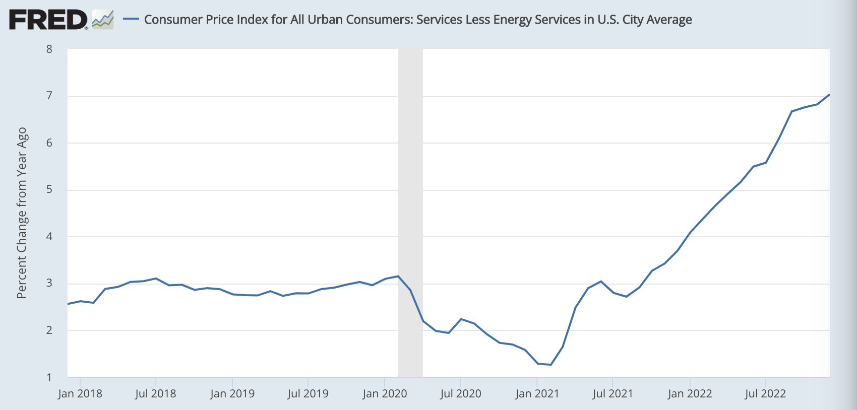 賃金インフレについては、金融やITなどの高給な領域でリストラが進んでいるため、全体としては上昇率が低下しているものの、サービス業の賃金には再加速の兆候が見られます。また、それを受けるような形で、サービス業においてはインフレは未だに加速しています。