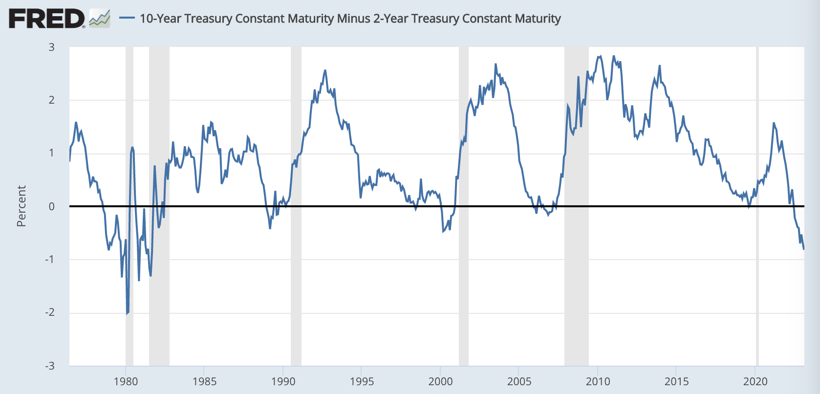 典型的な景気後退の前兆として知られる逆イールドは継続しています。これは短期金利の方が長期金利よりも高いというもので、現在よりも将来の方が景気が悪くなることを示唆しています。以下のグラフでは、逆イールドのあとには景気後退(グレー部分)が訪れていることが分かります。