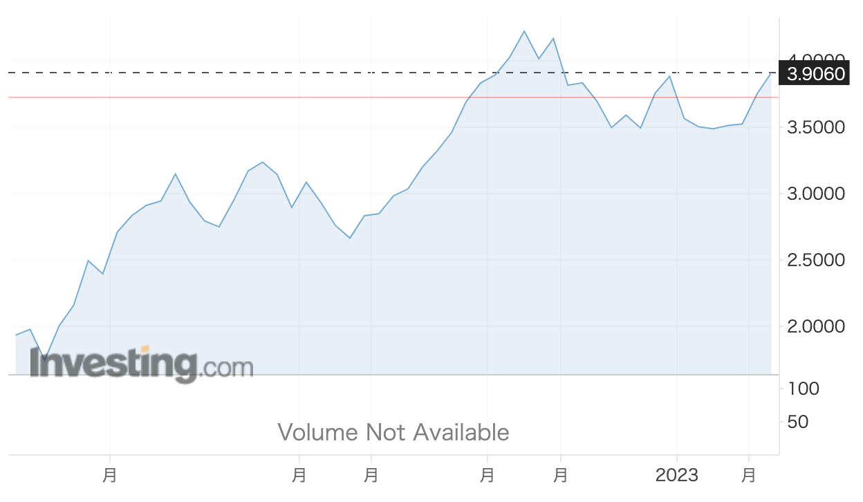 各種経済指標が強い中で、米国PPIも予想を大きく上回る水準で出てきたため、アメリカでは金利が再度上昇を始めており、昨年末以来の3.9%に達しました。