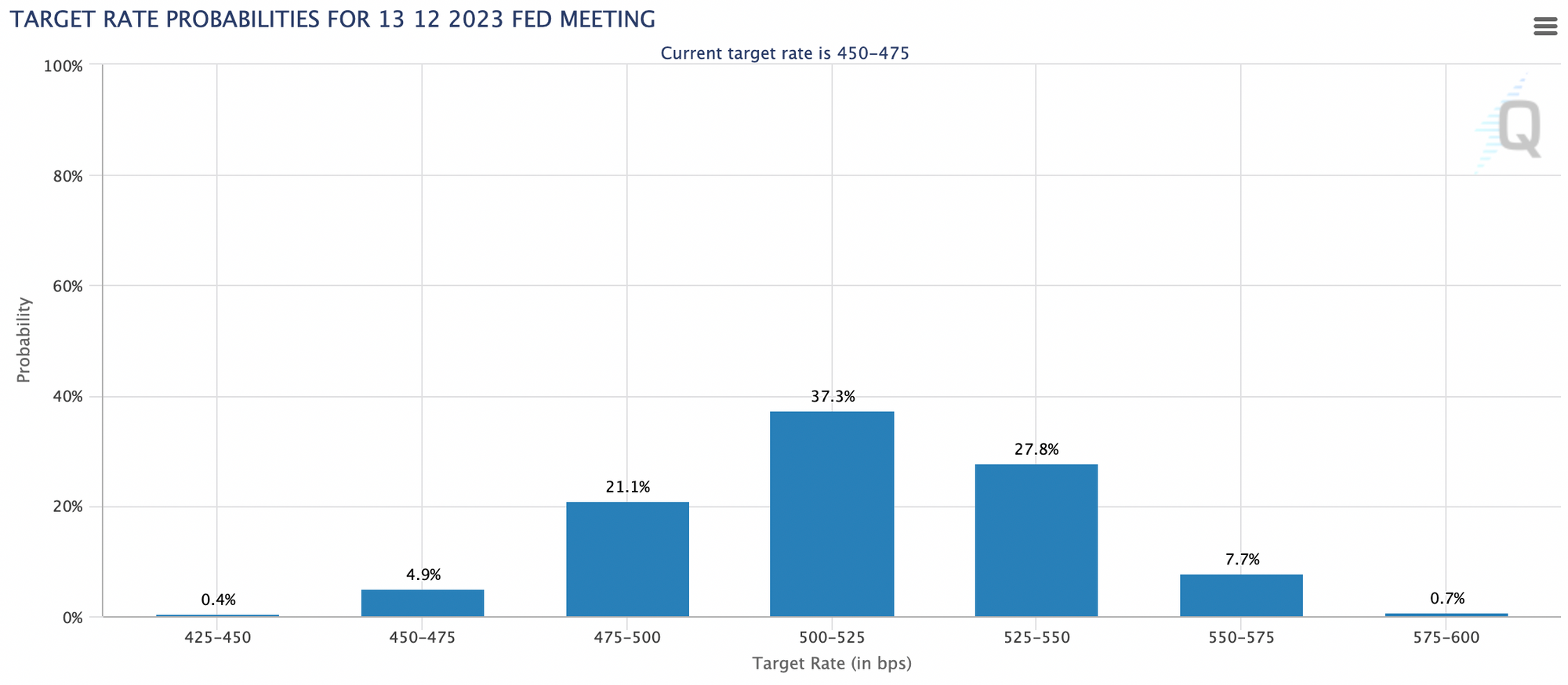 では、現在の債券市場はどの程度の利上げを織り込んでいるのかというと、以下のグラフの通り、2023年6月のFOMCでFF金利が5.25%-5.50%になると予想しています。つまり、現在の水準である4.50%-4.75%から、あと3回は利上げがあると考えているということです。