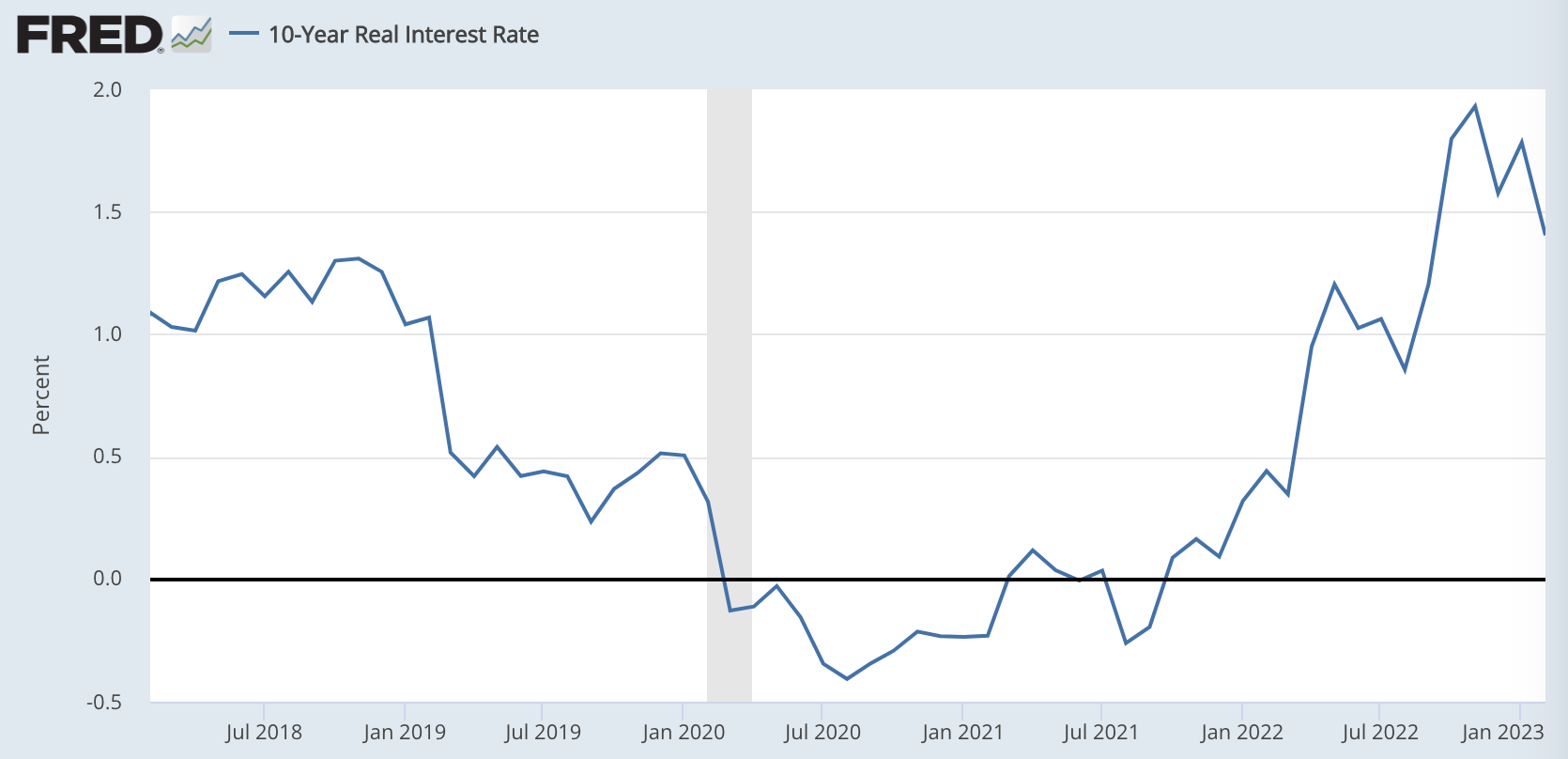 昨年の夏以降もFEDは利上げを続けているのに、どうして昨年の夏頃の水準なのかと思う方もいるでしょう。そこで、金融の引き締め効果を考えるにあたっては、実質金利を見てみるのがおすすめです。実質金利は、名目金利からインフレ率を引いたものであり、インフレに対して、どのくらい上乗せの金利があるのか(金融市場を引き締めているのか)を表しています。