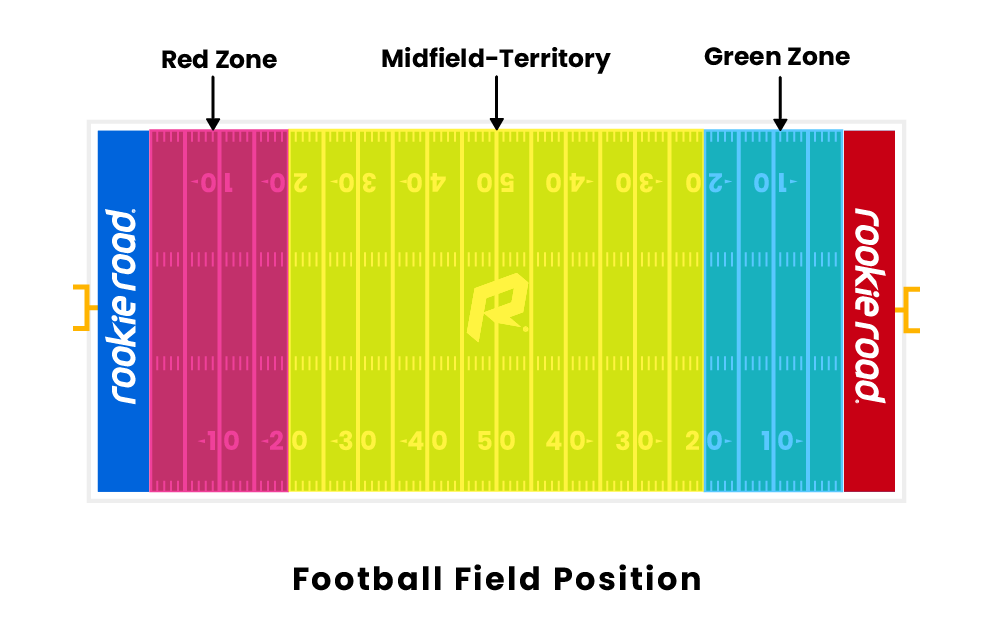 ミッドフィールドとは真ん中のあたりで、さらに相手陣地に攻め込んでタッチダウン寸前になるとレッドゾーンです。