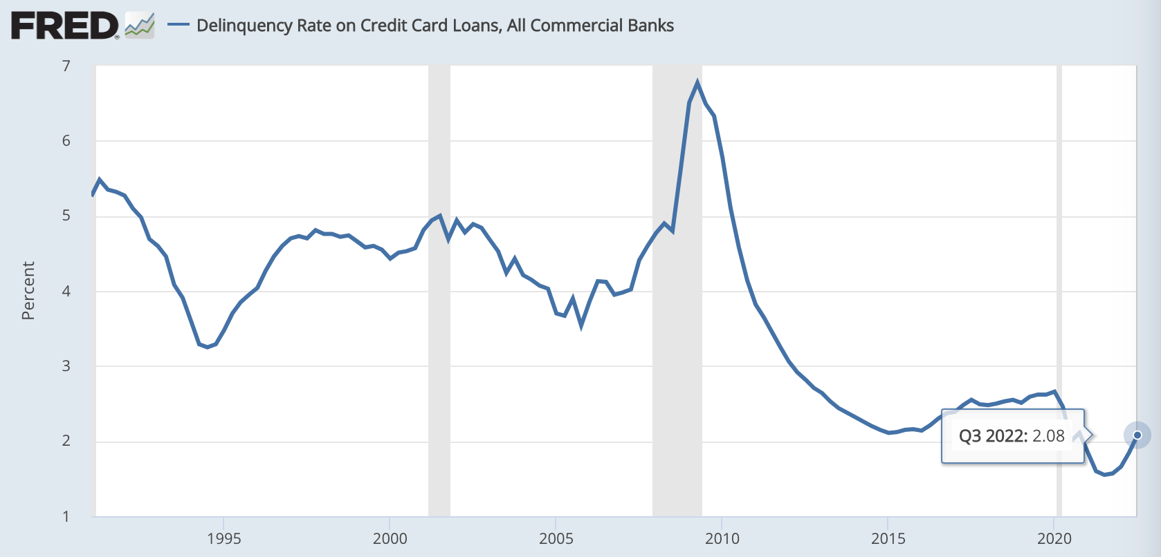 しかし、個人的には、まだ景気後退の可能性を意識した投資をすべきだと考えています。その背景の一例として、クレジットカードの延滞率や貸出審査基準の引き締め率などを見ていきたいと思います。