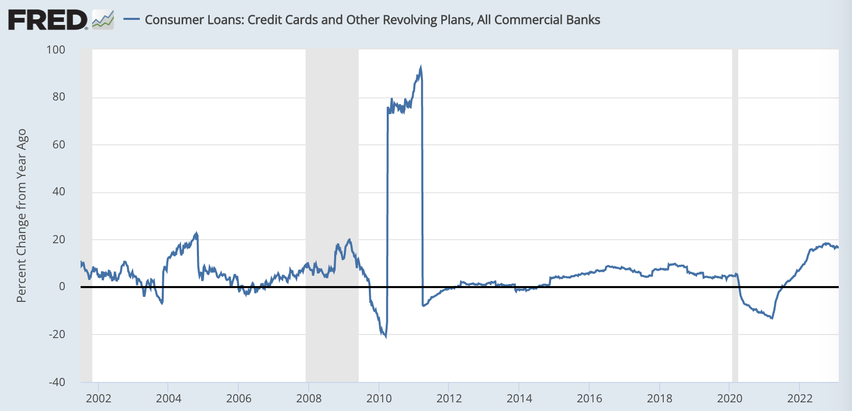 クレジットカードのローン金額が前年比でどのくらい増えているかを見てみると、かなりのペースで増えていましたが、その増加率も頭打ちになっているように見えます。