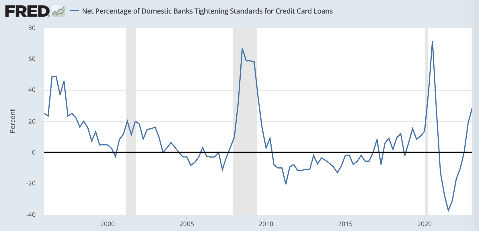 クレジットカードのローンに対する審査基準を引き締めた銀行の割合は30%程度となっており、これはリーマンショックやコロナショック前の水準を大きく上回っています。つまり、消費者はクレジットカードで借金をして消費を続けることが難しくなっているということです。