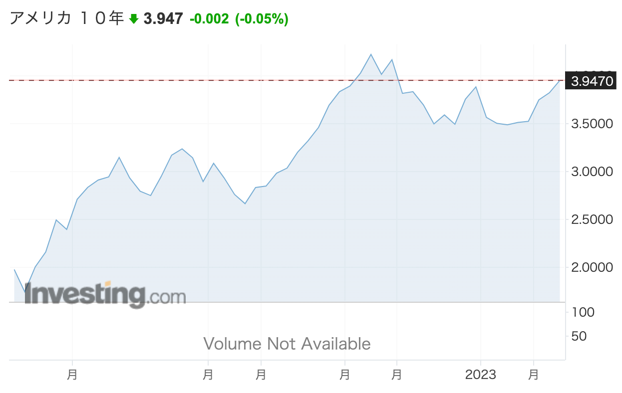 インフレ長期化懸念から、米国長期金利は4%近い水準に