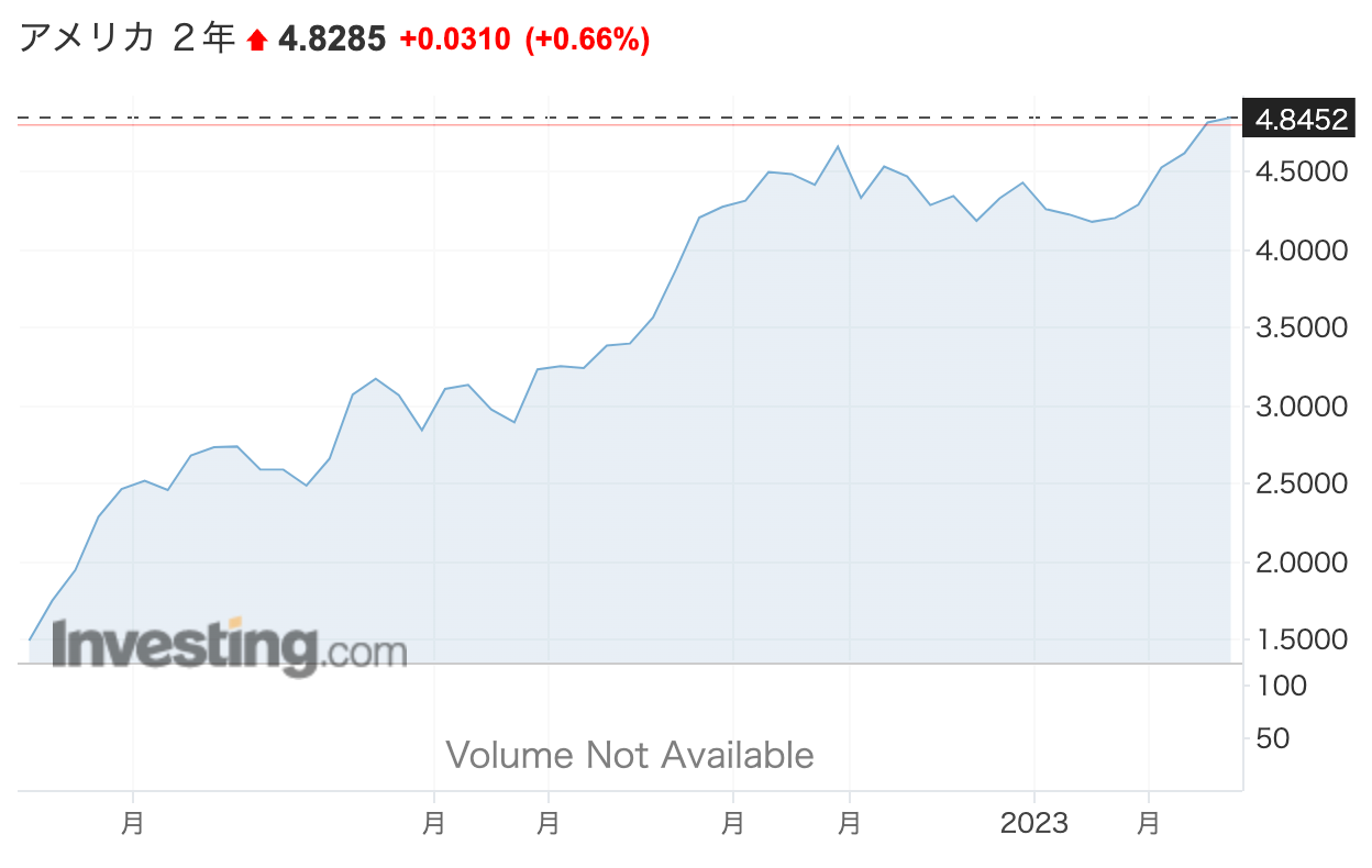 米国2年国債の金利は4.84%に達しています。