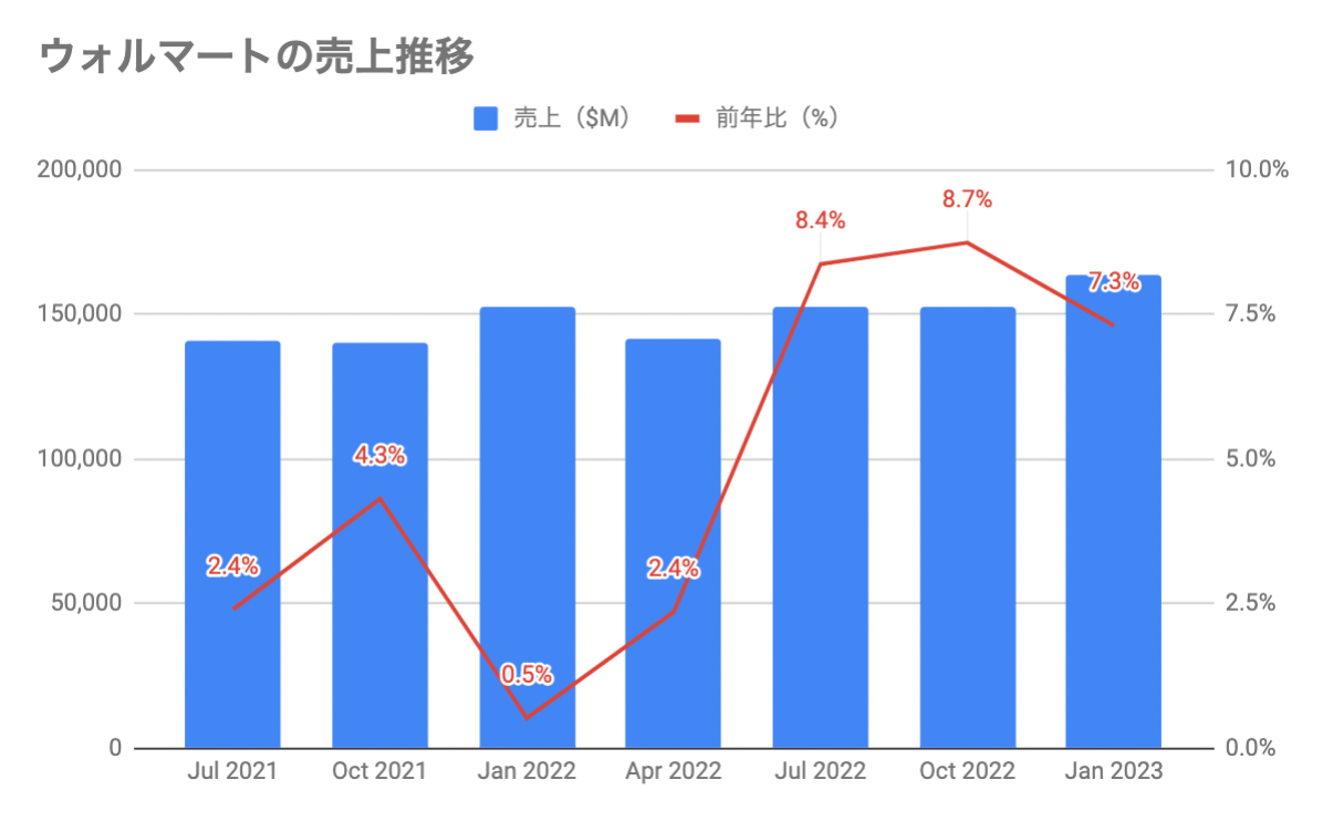 実際に、ウォルマートの売上推移を見てみると、前年比の売上成長率ではピークを超えているものの、依然として前年比+7.3%という高水準にあることが分かります。