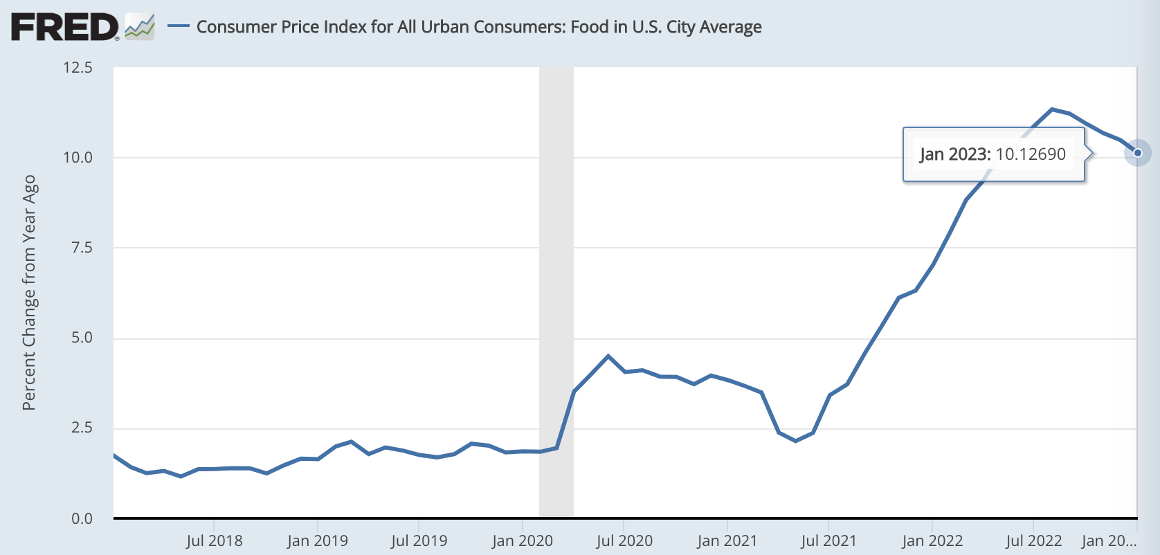 FREDのCPIデータを見ても、食料品のインフレ率は前年比+10%程度で推移しており、まだまだ高い水準にあります。