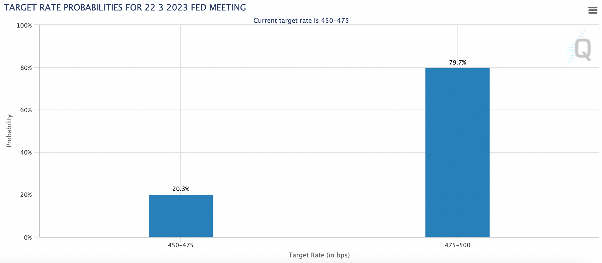 そのため、次回3月22日のFOMCにおいて、利上げが行われないのではないかと考える市場参加者も出てきています。以下は、次回FOMCにおける利上げ幅の市場予想ですが、これを見ると、0.25%の利上げが8割、0%の利上げが2割となっています。