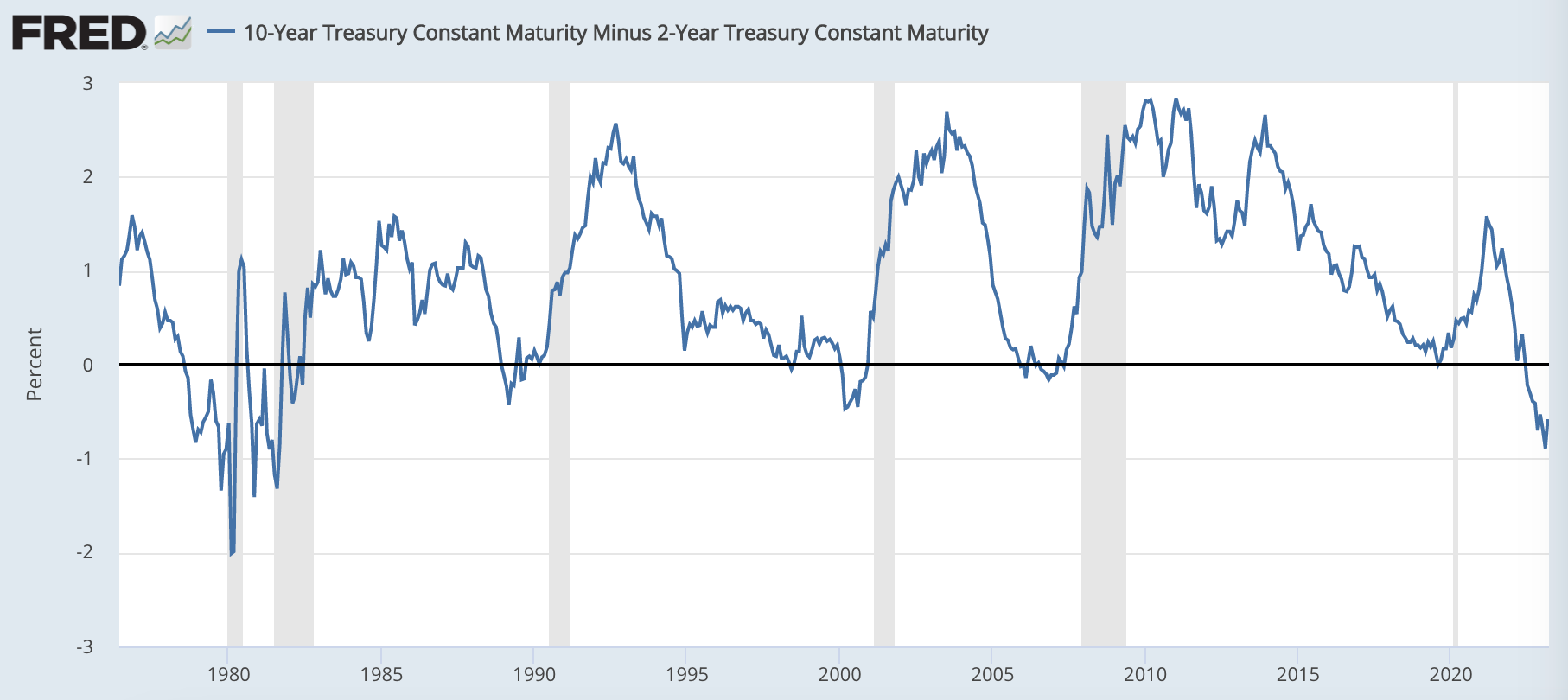 過去の金利推移を見ても、短期金利と長期金利が逆イールドから元に戻った後には景気後退(グレーの網掛け)入りしていることが多いことが知られています。今回のSVB破綻をきっかけに短期金利が下落して逆イールドが解消に向かい始めていますから、景気後退を警戒するのは自然だと思います。