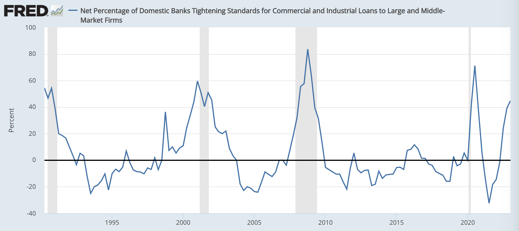 銀行の貸出基準の厳格化率は、直近でも上昇を続けており、44.8%まで上昇しています。
