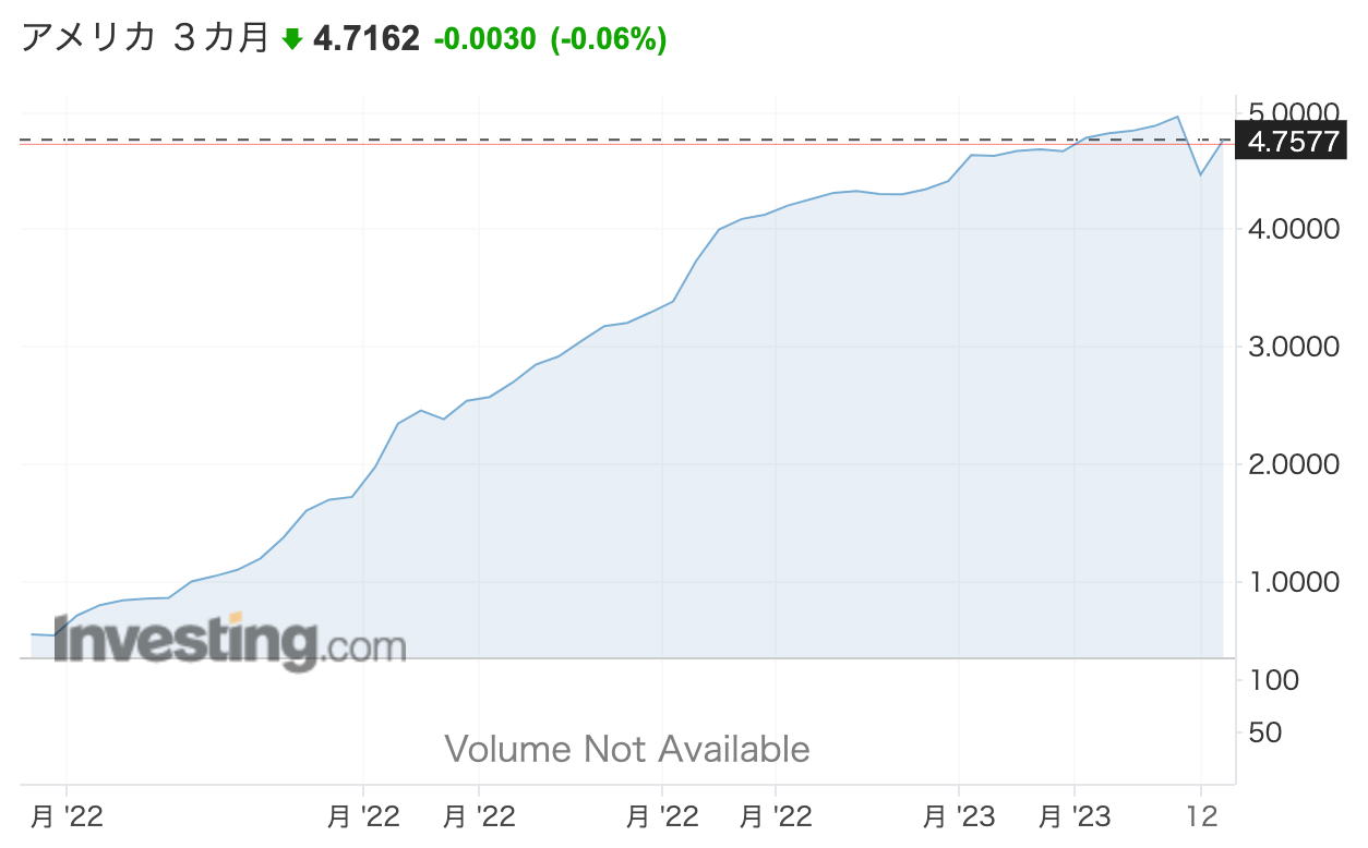 米国3ヶ月国債の金利をみると、すでにピークを打って下落に転じているため、「FRBは債券市場の後追いだ」というガンドラック氏の言葉を参考にするなら、次回以降の利上げは行われないでしょう。