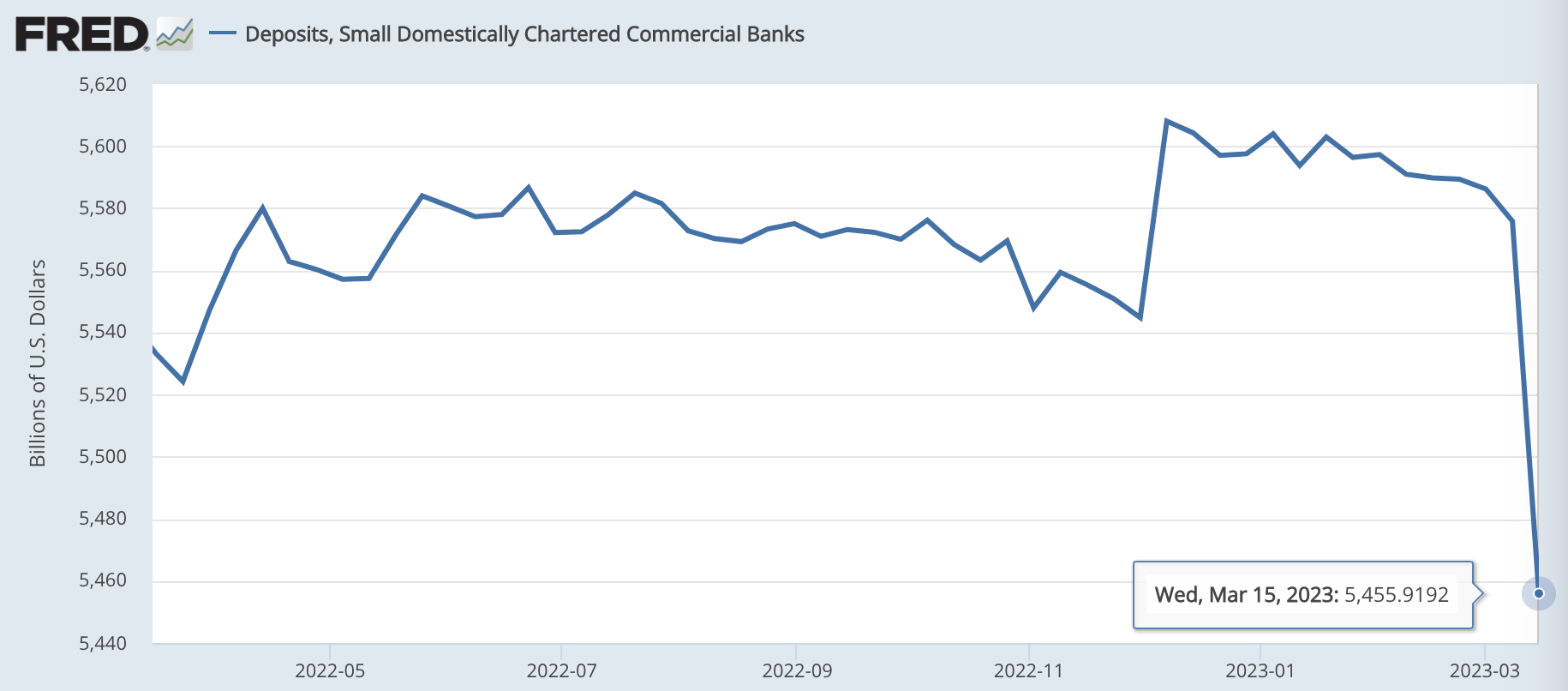 そこで、実際に米国の小規模な銀行の預金額をFREDで確認してみると、3月15日週までは大きく預金残高が減っていることがわかります。