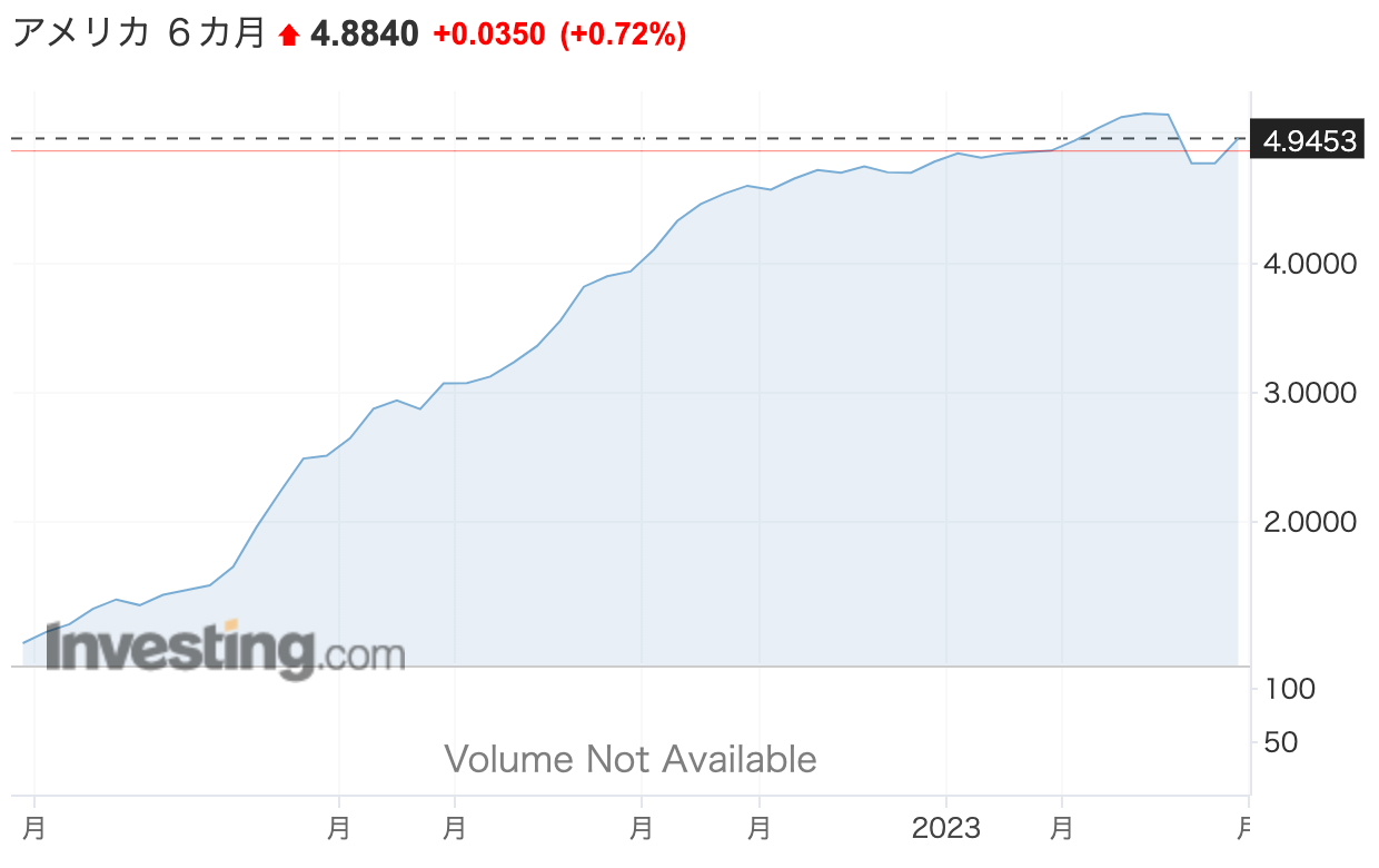 現在、米国6ヶ月国債の金利はまた上昇して4.88%と5%に近い水準となっています。