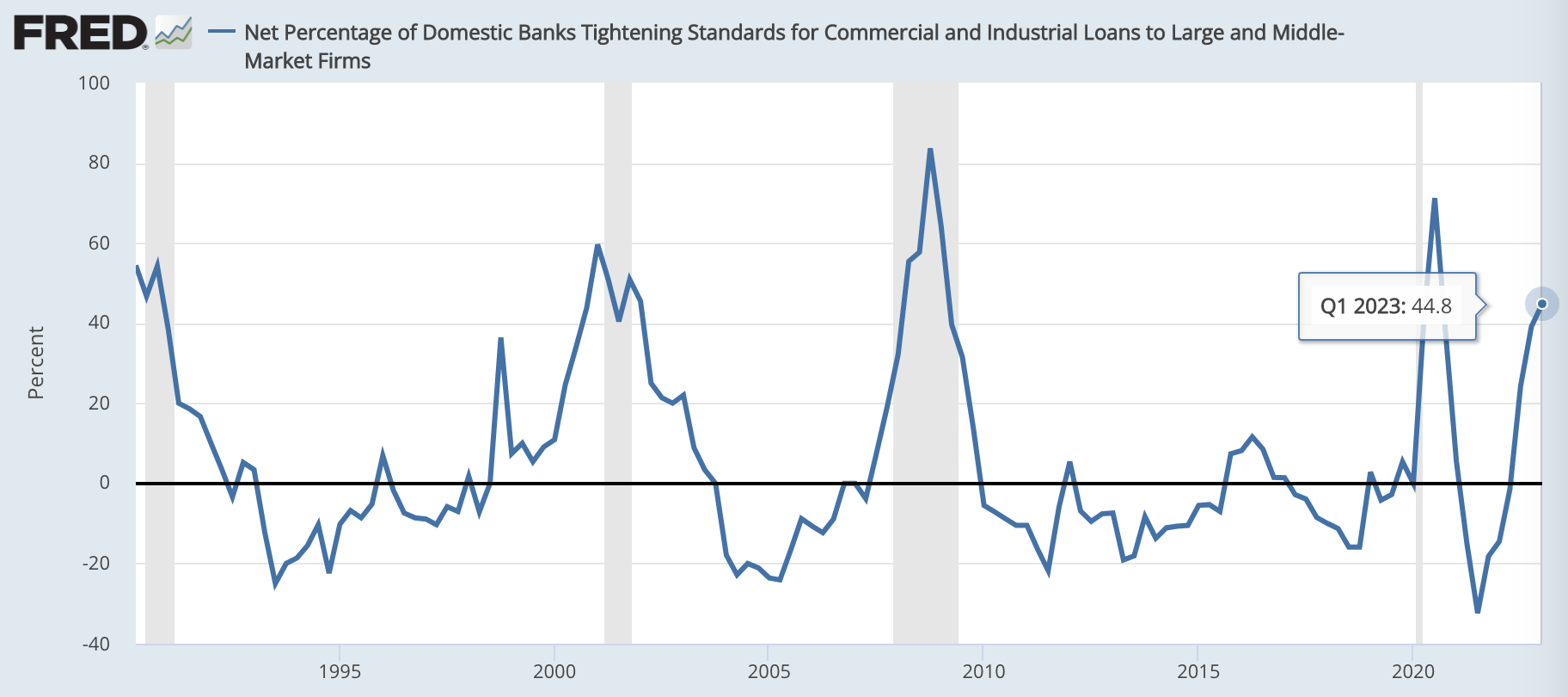 過去にも紹介してきたように、米国の銀行の融資基準はすでに過去の景気後退時の水準まで引き上げられています。