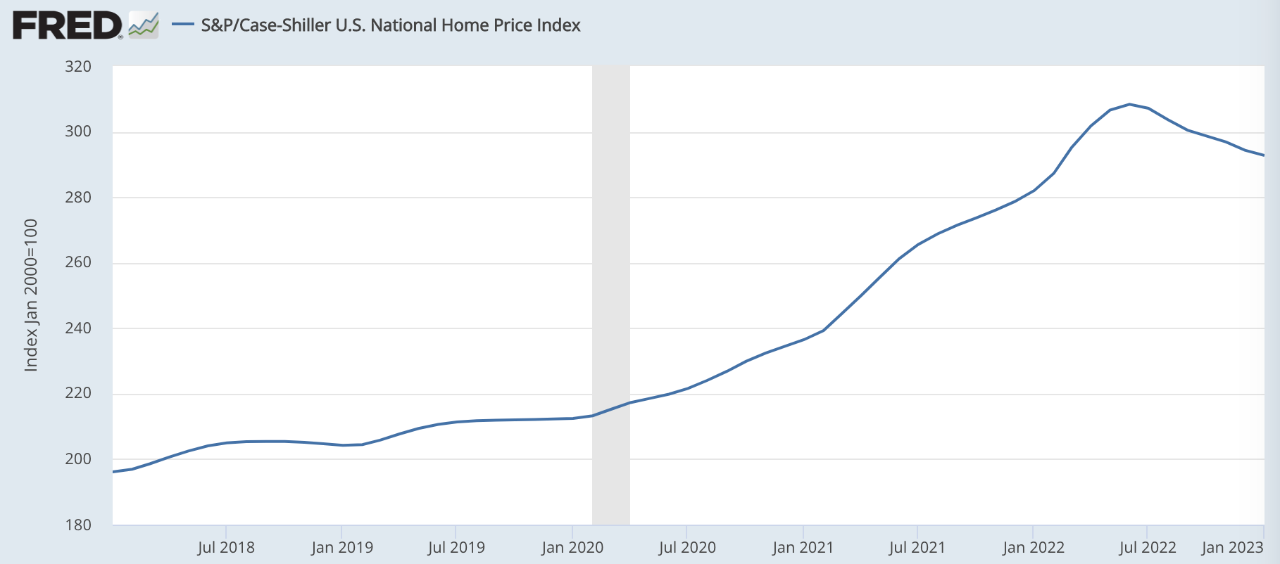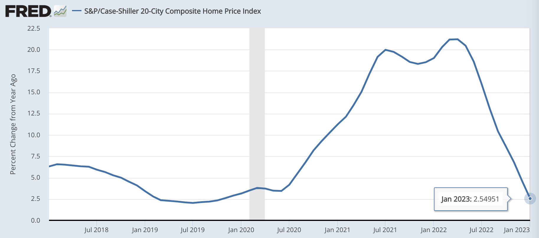 S&Pケースシラー住宅価格指数が下落に転じていることは、以前のニュースレターでもお伝えしている通りです。先週3月28日に発表された最新(2023年1月)の数値でも住宅価格がすでにデフレに入っていることが改めて確認されました。