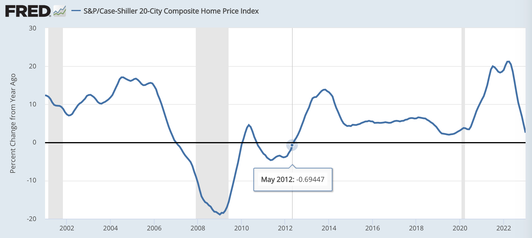 ケースシラー住宅価格が前年比マイナスになるのは2012年以来