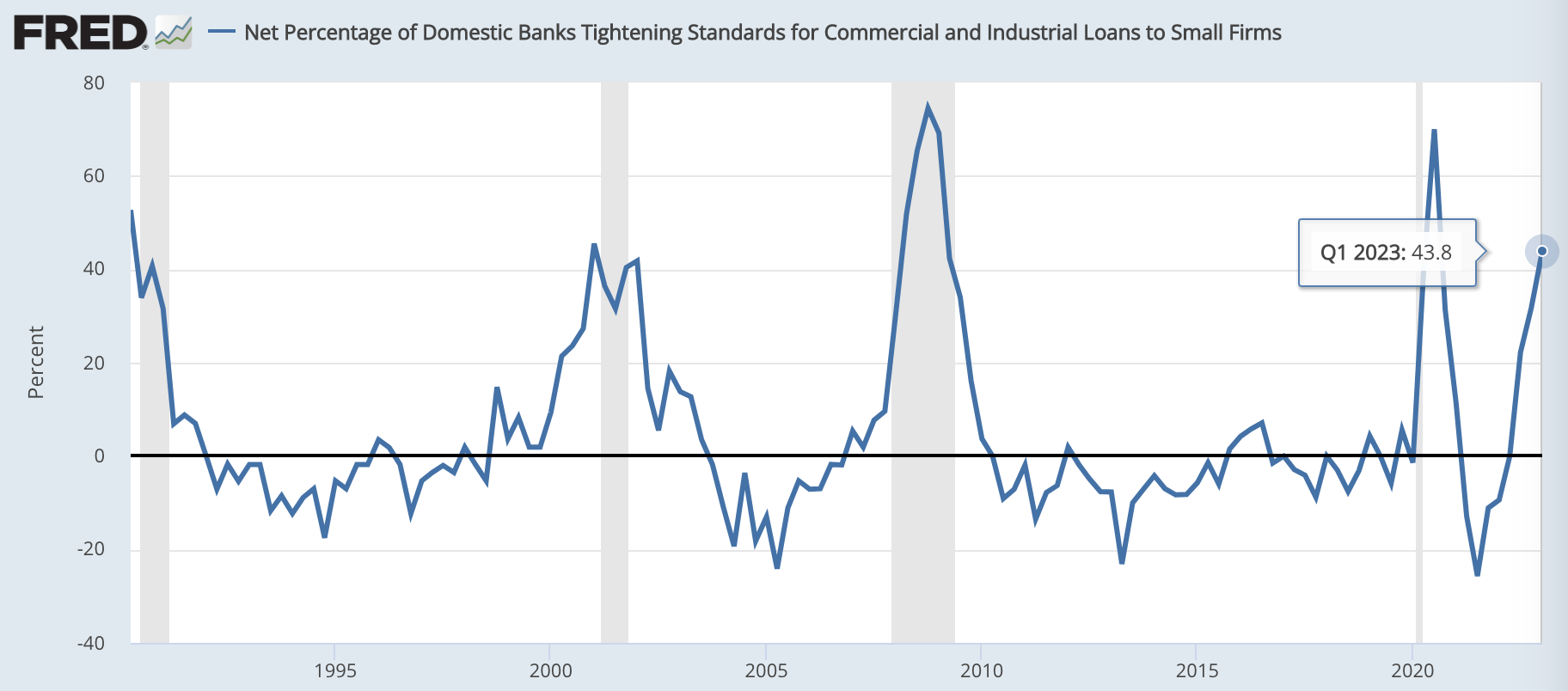 以前にも紹介した通り、中小企業への融資基準を引き締めた銀行の割合はすでにリーマンショックや新型コロナショックの時期に匹敵する水準に上昇しており、企業は今後資金の調達が非常に困難になることが予想されます。