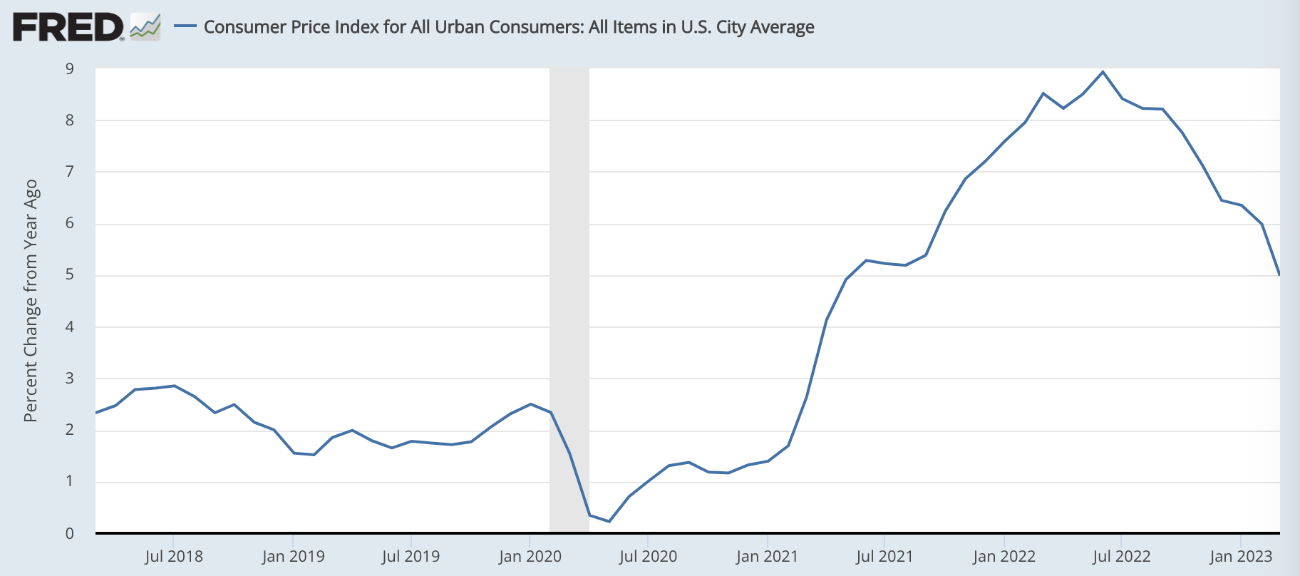 2023年4月12日に発表された米国CPIは予想の前年比+5.2%を下回る+5.0%でした。厳密には+4.98%であり、インフレ率はついに4%台まで減速しました。