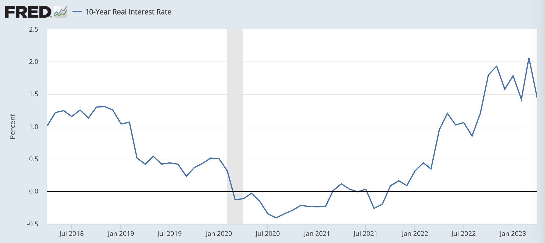 例えば、債券市場の予想通りに金利が3%〜4%に落ち着き、期待インフレ率が2.31%から4%程度まで上昇するのであれば、実質金利は-1%〜0%程度まで下がることになります。