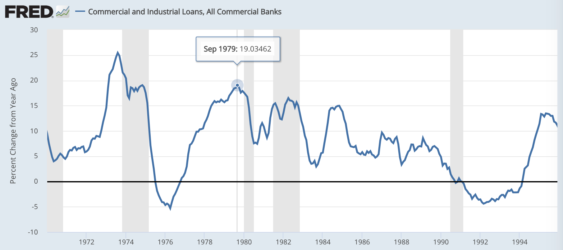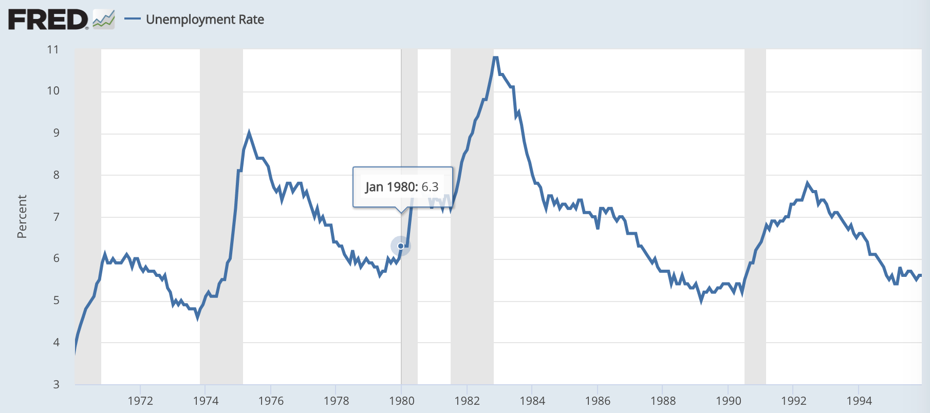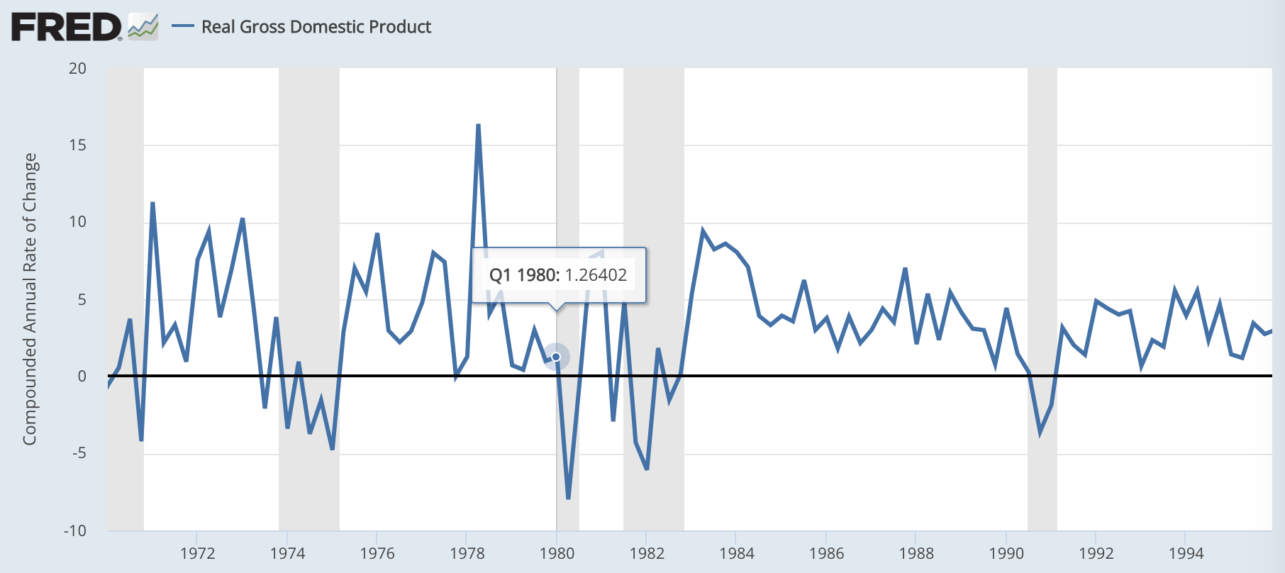 銀行融資の減速を受けて、4ヶ月後の1980年1月に景気後退に突入しました。