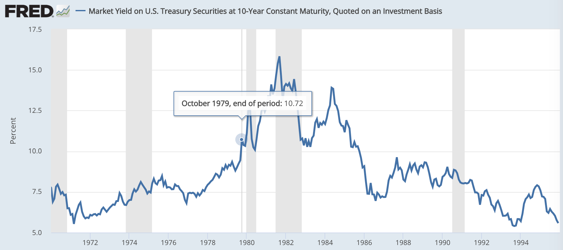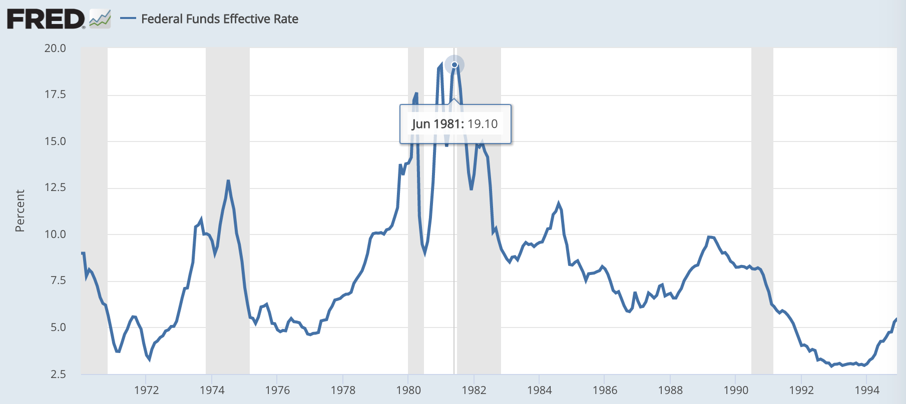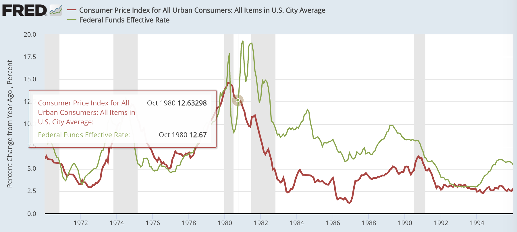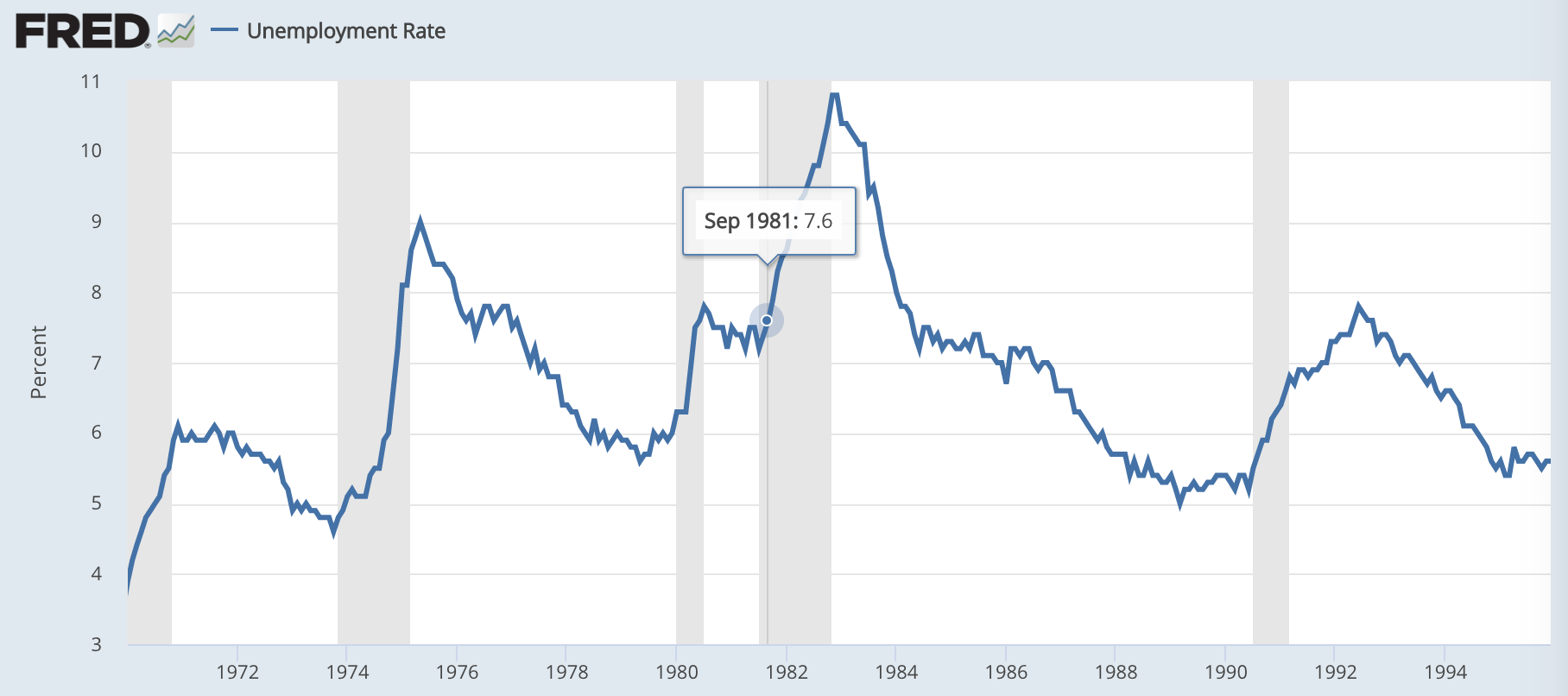 景気後退が終わったばかりで、インフレ率もすでにピークを超えていたことを考えると、ここでもう一度、金融を引き締めるという判断はなかなか出来るものではないでしょう。これが当時のFED議長ポール・ボルカーがタフなインフレファイターとして尊敬されている理由です。