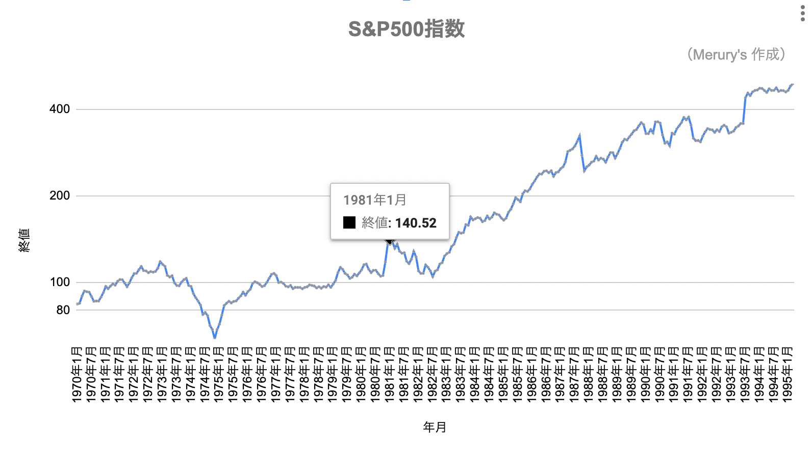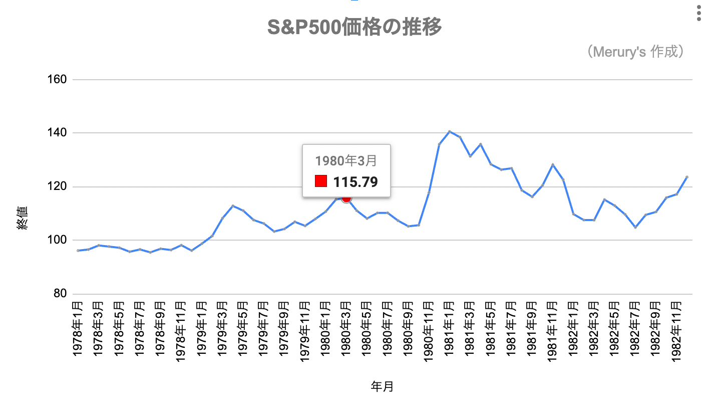 インフレ率の低下を受けて、1980年末には大きく上昇していた株価ですが、FEDが金融引き締めを続けたため、株価も1981年の1月には下落に転じています。
