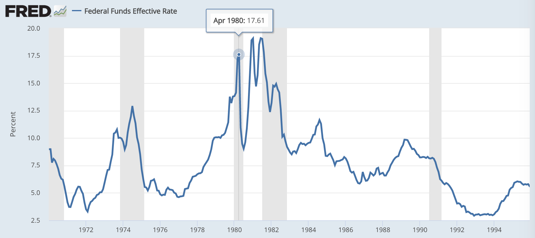 これは個人的な推測ですが、おそらく当時のFEDは実際のインフレ率だけでなく、株価をインフレの先行指標として見ていたのだと思います。そのため、1980年3月に株価が下落するまで、あるいは1981年1月に株価が下落するまで、それぞれ金融引き締めを続けたのでしょう。