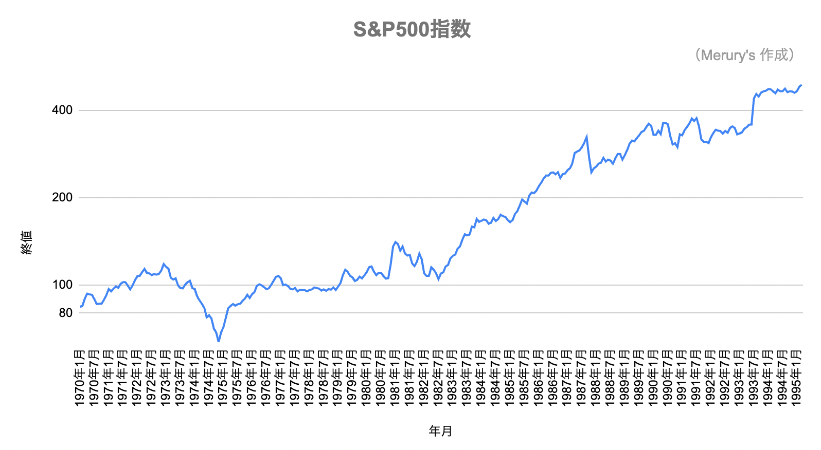 1980年代の前半は、インフレは収まったものの、失業率は11%近くまで達して、ドルは高く、小さな地元の金融機関はバタバタと倒れていくという、暗い時代だったことが想像できます。その中で、株価は1983年から1987年頃までトントン拍子に上昇しています。