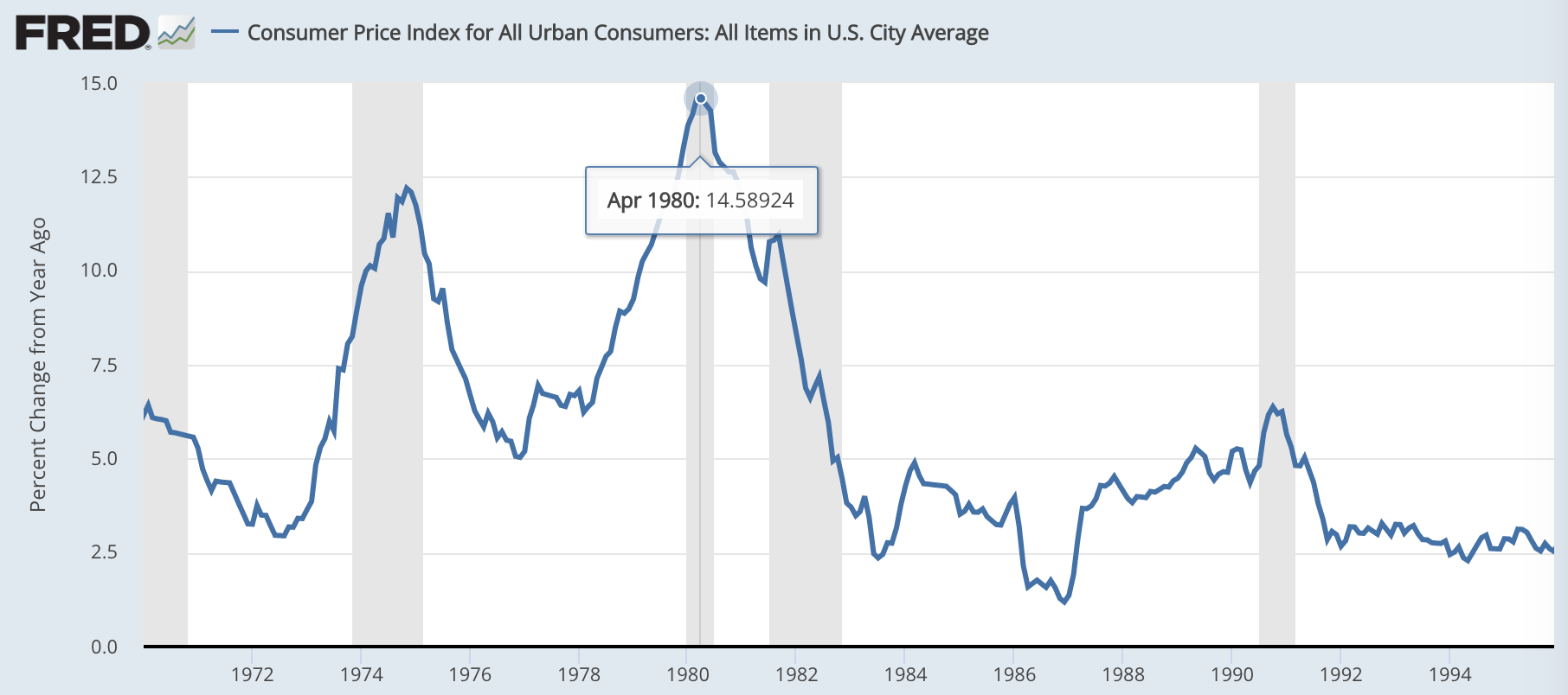 景気後退入りしたことで、1980年4月にはインフレ率がピークを超えました。