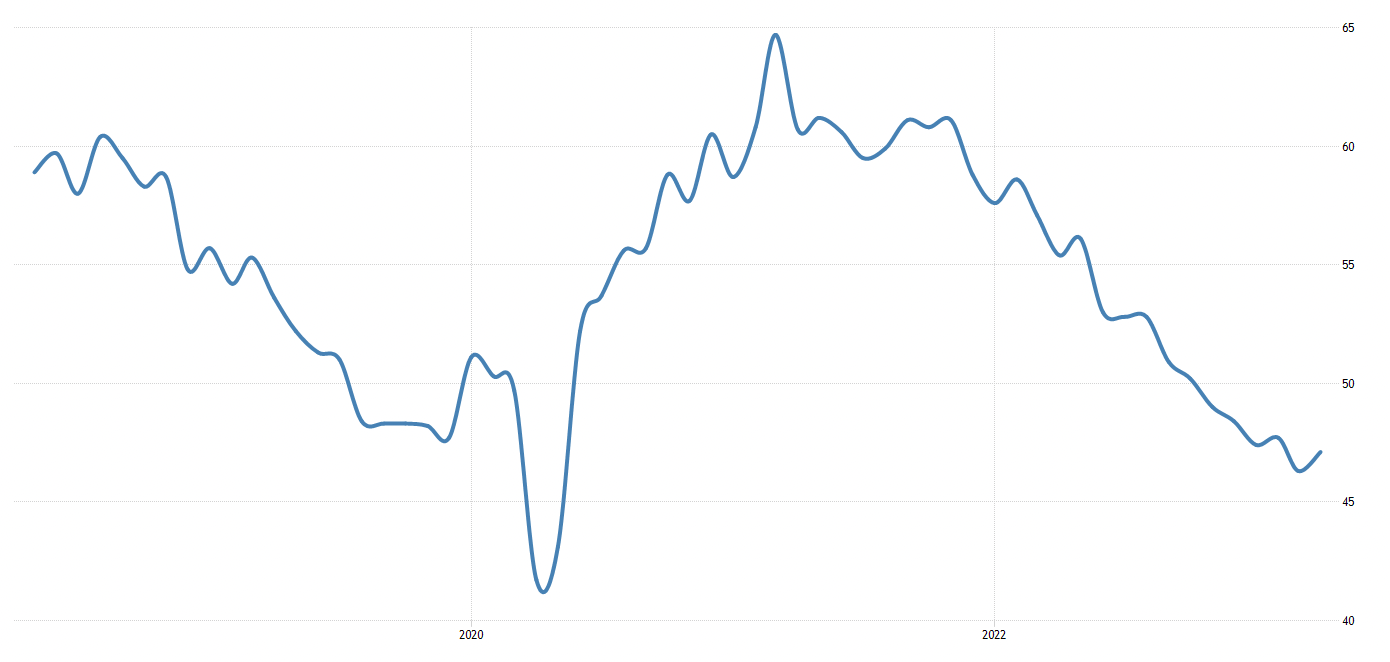 とはいえ、相変わらず、50を下回っていますし、下落トレンドにあることに変わりはありません。また、前回同様に依然として新型コロナ前後の水準にあります。全体として、景気が強いというわけでは決してありません。