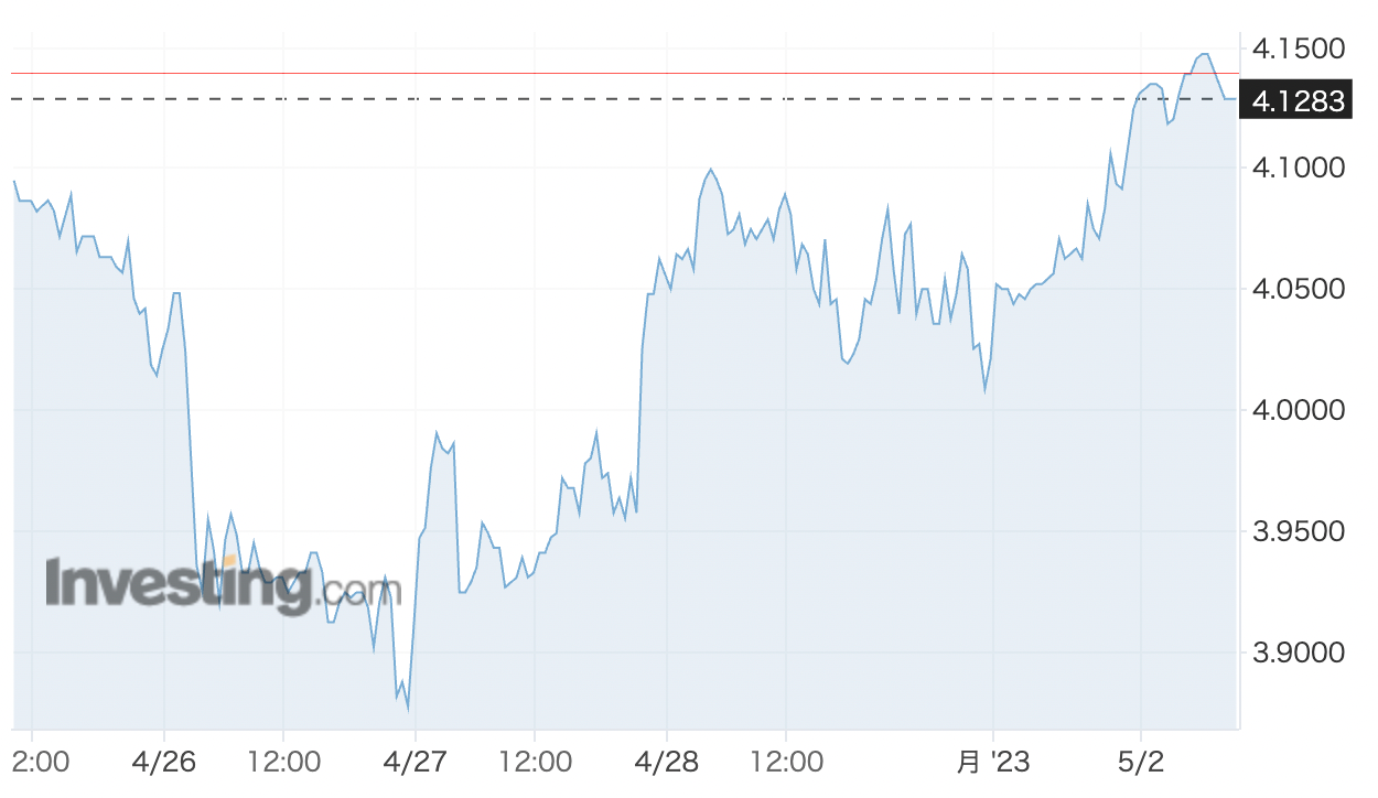 米国2年国債金利をみると、それを織り込むような形で、先週末には4%近くで推移していた金利が4.12%程度まで上昇しています。