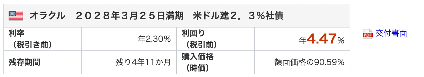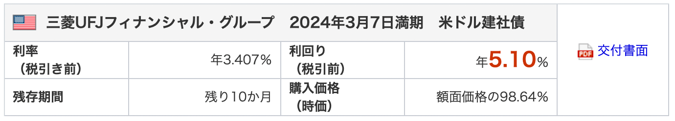MMFよりも高い4%台後半の利回りが約束されていて、満期まで保有すればキャピタルロスの心配もないため、アップサイドはないですが、一部の待機資金を使ったお茶を濁す程度の投資としては検討しうるでしょう。