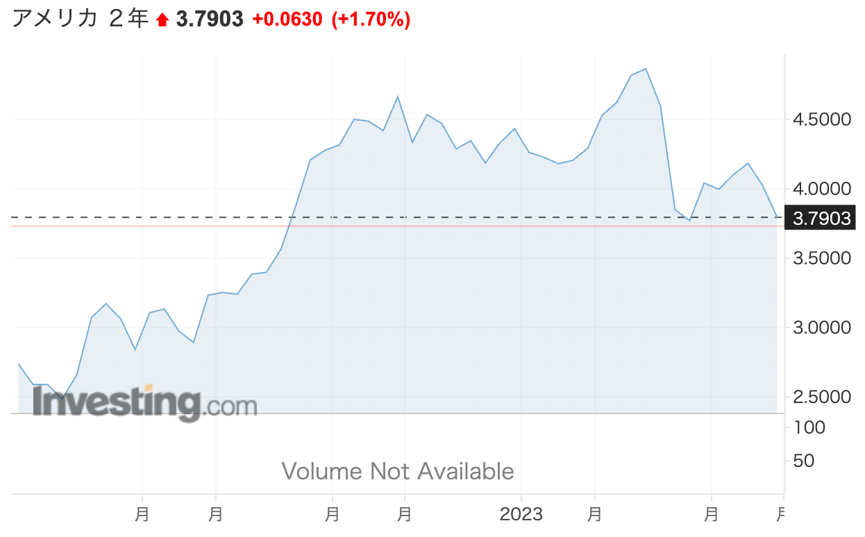 債券市場は当然「今のFF金利は維持できない」と考えており、米国2年債の金利は3.7%とFF金利よりも低い水準となっています。つまり、将来の利下げを織り込んでいるということです。