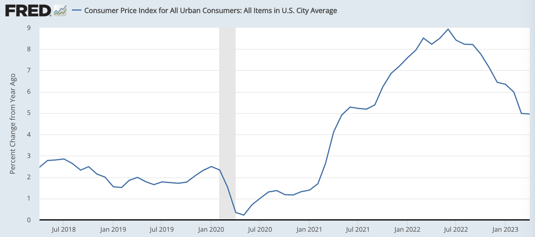 2023年4月の米国消費者物価指数は前年比+4.9%で、コンセンサスの+5.0%を下回ったものの、インフレが下げ渋りを見せていることが分かりました。