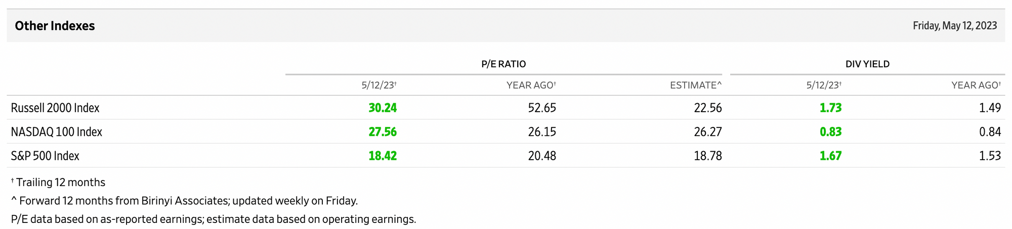 配当利回りも1.67%と1年前の1.53%からは上昇していますが、何度もいうようにFF金利は5.25%、ほぼ無リスクの米ドルMMFで4%程度の利回りがありますから、割安感はありません。