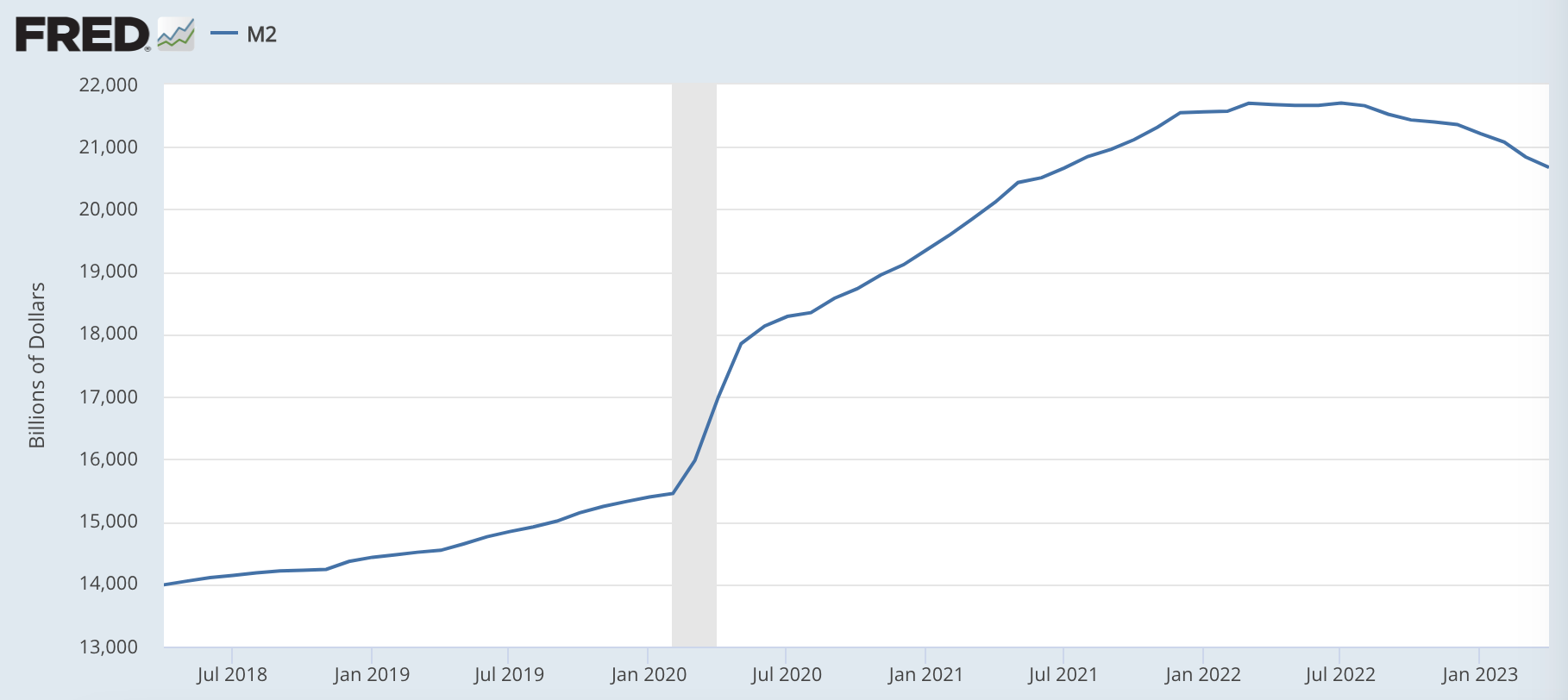 これらの金融引き締め政策によって、米国のマネーストック(= マネーサプライ)は以下のように減少しています。