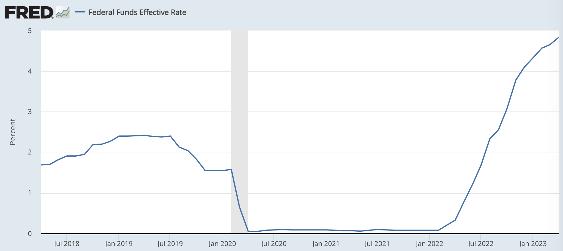 利上げは金利をあげることで、事業者や消費者がお金を借りることを難しくする金融政策です。事業者や消費者がお金を借りると、銀行の信用創造機能によって世の中のお金の量が増えます。逆に、お金を借りにくくすれば、過去の借金が返済されるに従って、世の中のお金の量は減っていきます。2023年5月末現在、政策金利(FF金利)は5.00%-5.25%です。