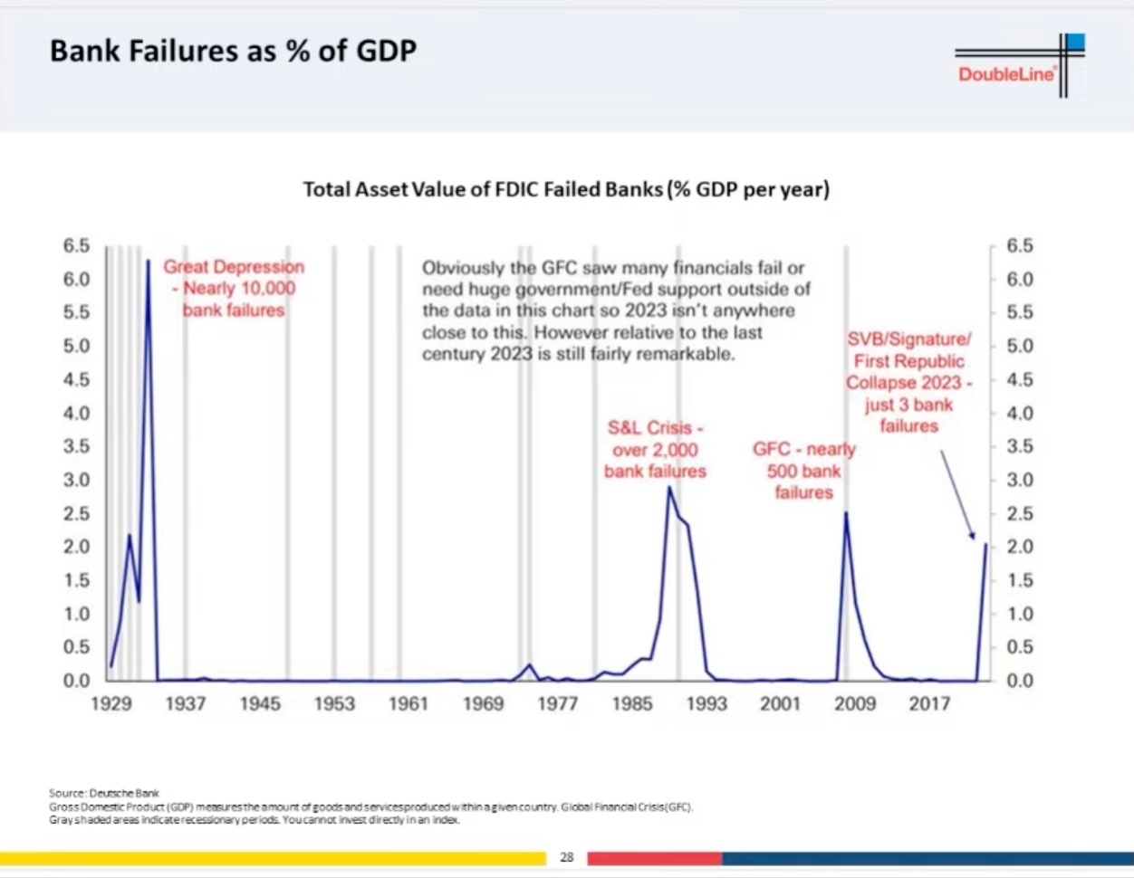 今回、ガンドラック氏は3月に経営破綻した銀行の資産規模がGDPに占める比率というデータを持って、その影響の大きさを語りました。