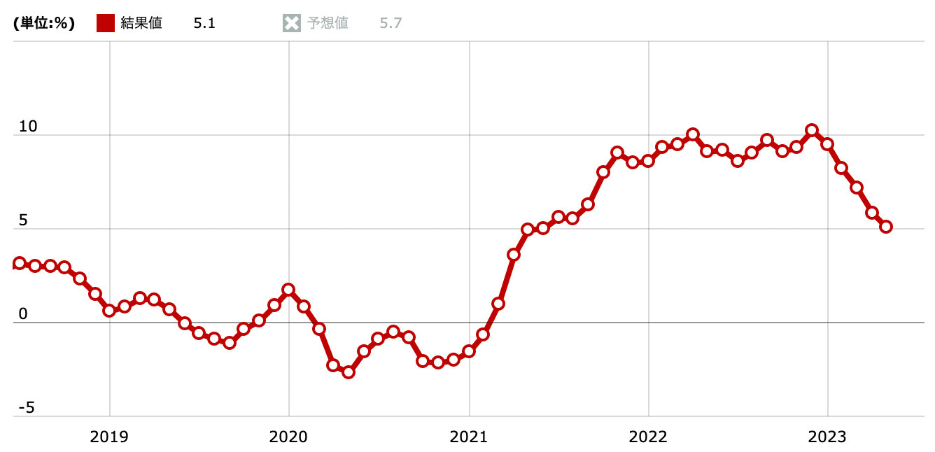 しかし、前年比+5.1%というインフレ率は依然として十分に高水準であることを忘れてはいけません。