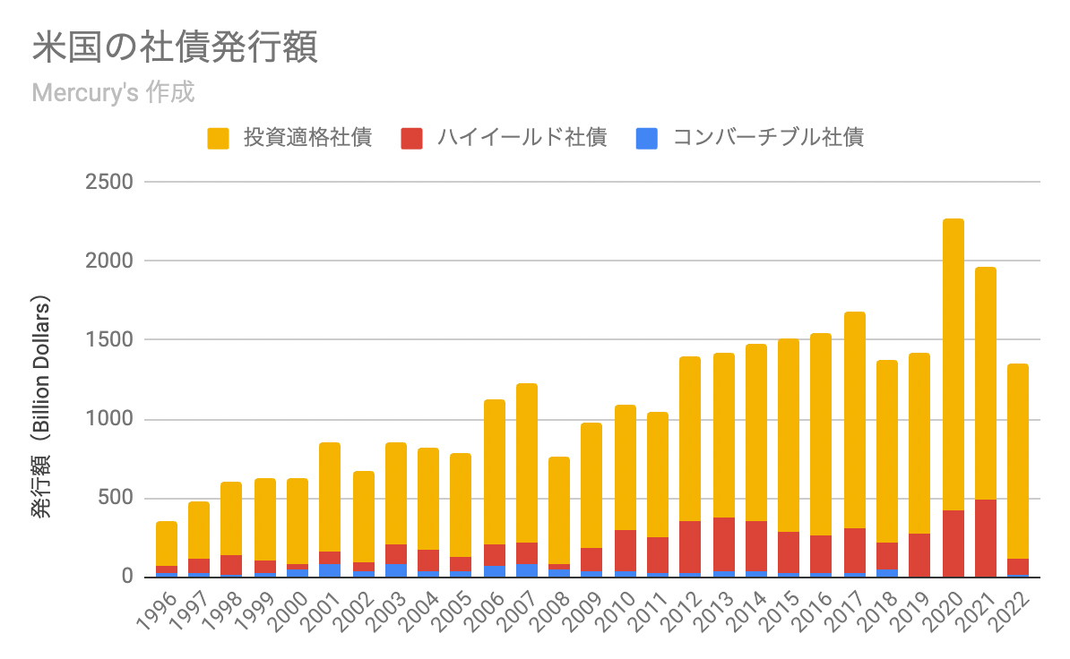 まず、社債が過去の各年にどのくらい発行されたのかを見ると、以下のようになっています。