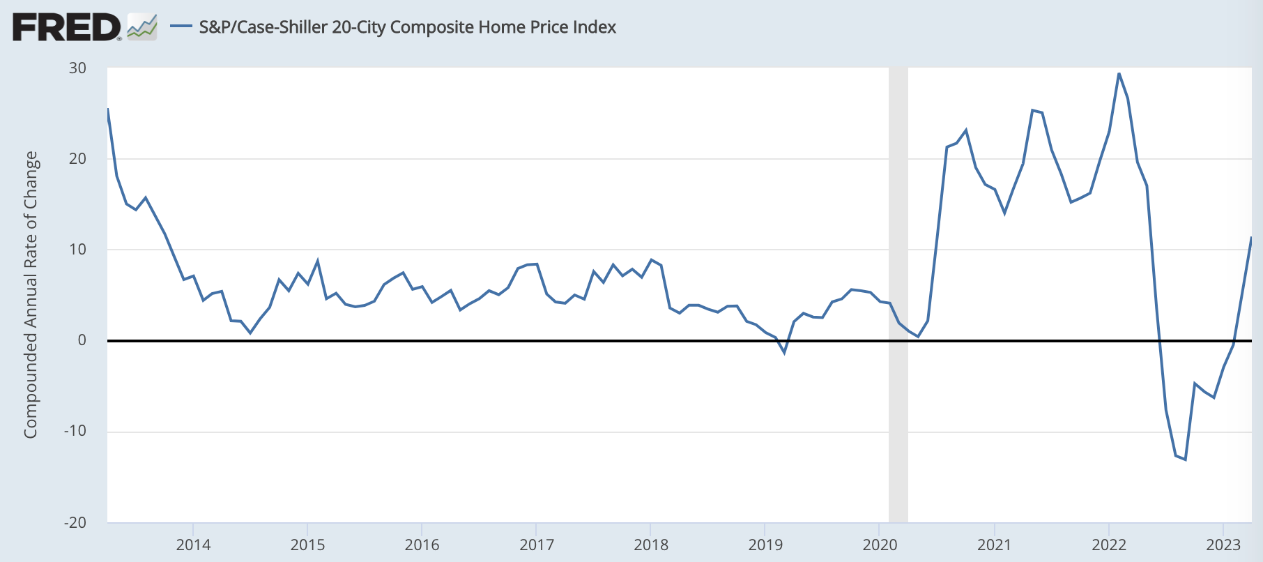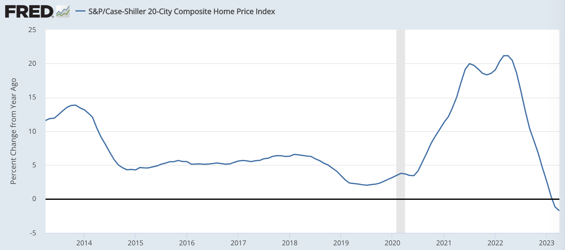 2023年6月27日に発表された、4月分のケースシラー住宅価格指数(20都市)は前年比-1.70%でした。これは前回の-1.15%よりも減速しましたが、コンセンサスの-2.55%と比べると高い数値でした。