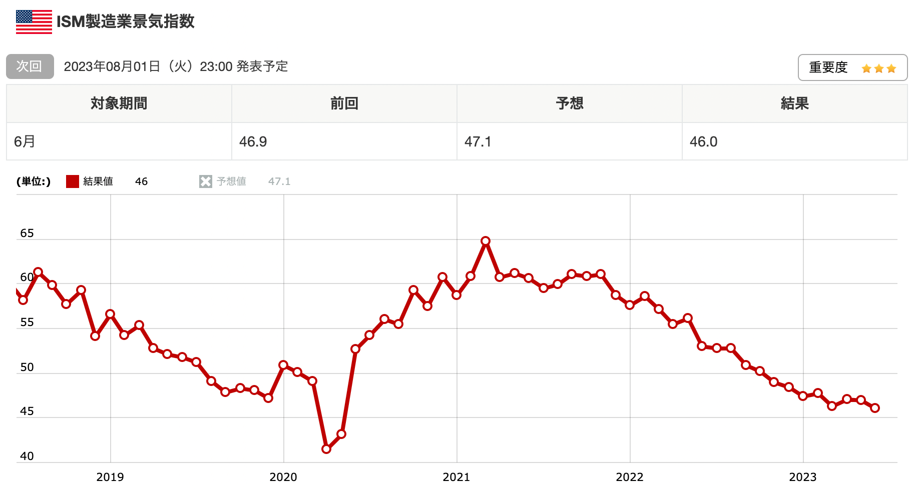2023年7月3日に発表されたISM製造業景況指数は46.0でした。ISM製造業景況指数は50よりも低いと、景気が悪化していることを示すので、2023年6月も製造業の景気は悪化したことになります。これで8ヶ月連続の景気悪化となります。