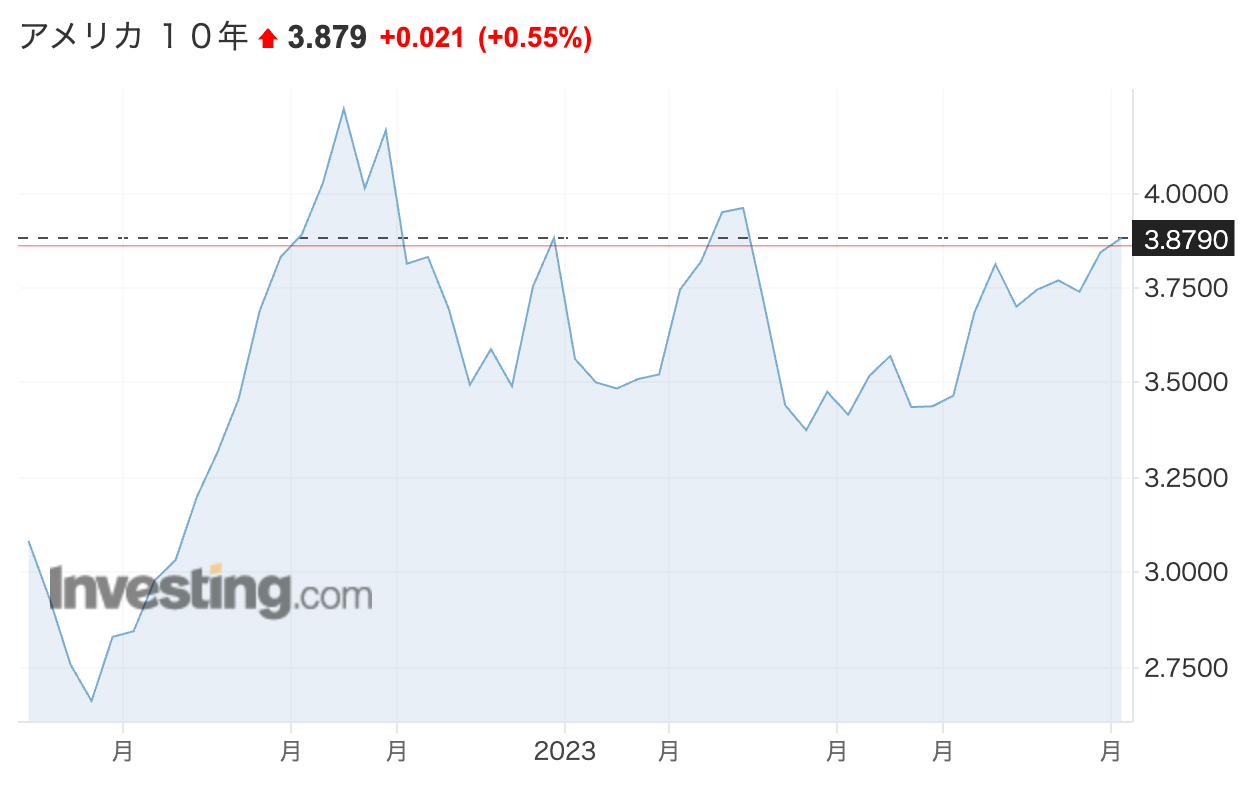 まず、米国10年金利の推移を見てみると、ざっくりと3.5%〜4.0%の間を推移しています。
