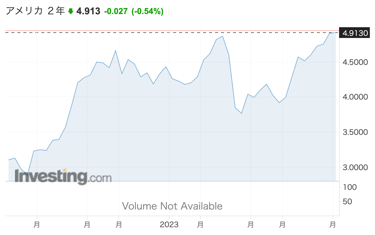 さて、短期金利である米国2年国債金利は、超短期金利であるFF金利におおむね連動します。直近は、2年金利が4.9%程度であり、FF金利が5.00%〜5.25%ですから、どちらもおおむね5%程度です。